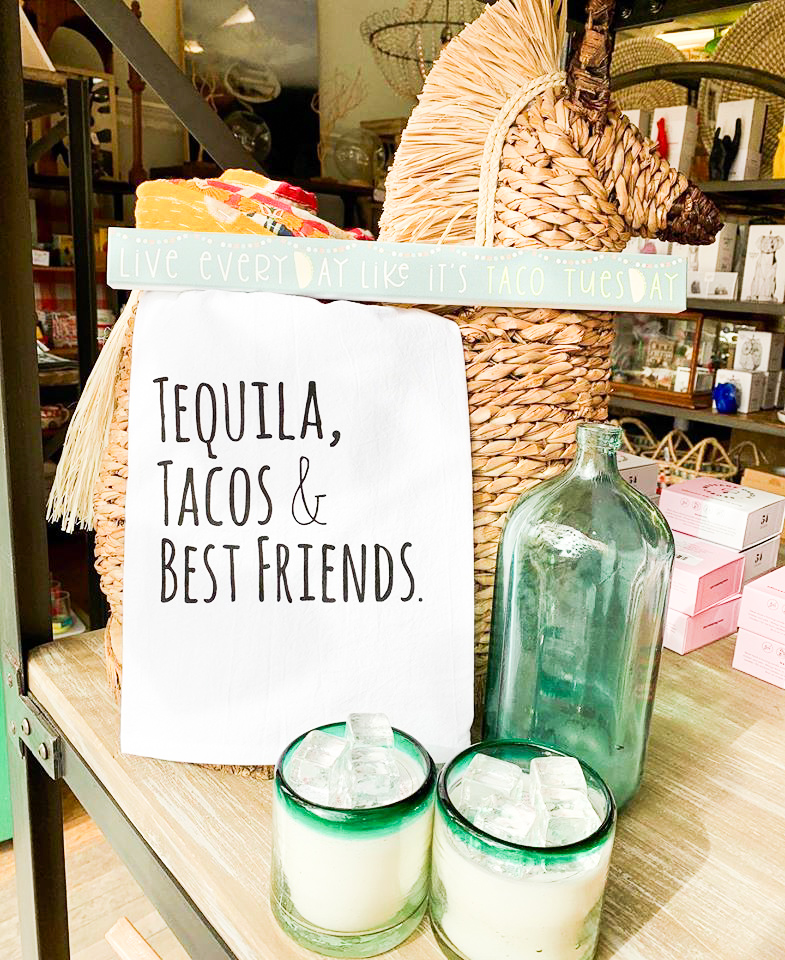 The physical store (and web store) is stocked with Sundi’s favorite things; a very limited list includes towels, candles, books, children’s gifts, jewelry, mugs, welcome mats, clothing, and cards that will make you roll on the floor with laughter. Her store is FULL of positive and comedic energy, and while we cannot walk through it and soak in all the wonderfulness right now, we CAN still shop it online!